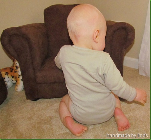 Size: Well as you can see from the pictures, this kid is a string bean which blows my mind because he can EAT! At the doc’s office he weighed in at 17lb and 9oz and 27 3/4 long. The doctor said he’s doing well and that he’s right on his usual track. He’s still fitting into his usual clothes of a mixture of 6-9m and 12m clothes. The waist fits good with the smaller sizes but the length is better on the larger sizes. We’re still fitting nicely into size 4 diapers.